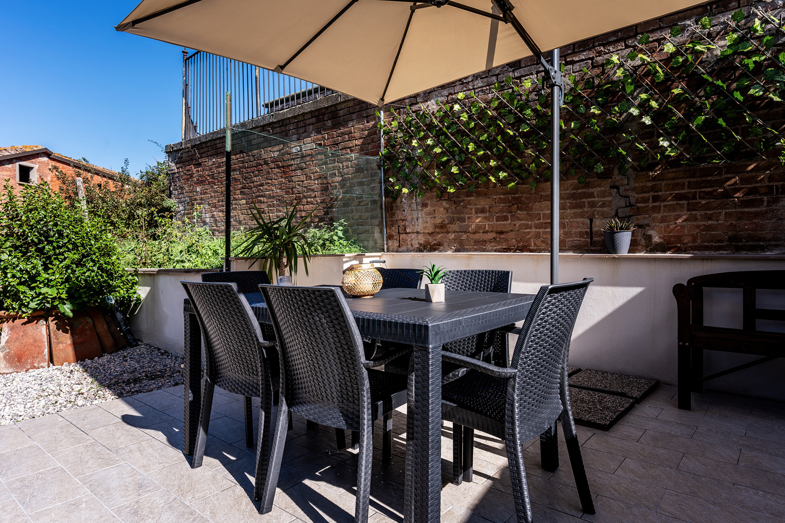 La terrazza privata dell’appartamento è un luogo incantevole dove trascorrere momenti di puro relax. Immersa nella quiete del borgo, è perfetta per iniziare la giornata con una colazione all’aria aperta, per un aperitivo al tramonto o per una cena sotto le stelle. Arredata con gusto e dotata di un tavolo spazioso e comode sedute, la terrazza è il luogo ideale per goderti la bellezza del panorama circostante in totale tranquillità.